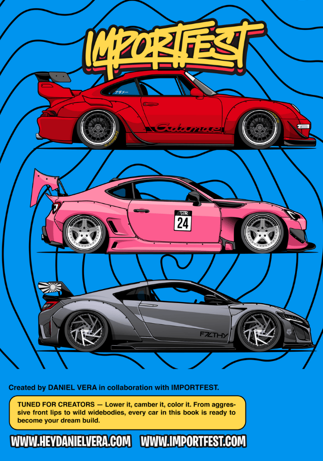 Don’t miss our most exciting collaboration yet with digital artist Daniel Vera, featuring some of the wildest modified cars from ImportFest! This exclusive 50-page coloring book comes FREE with a poster of the featured Widebody RX7 cover car — all packaged in a custom hard copy and sealed in shrink wrap!